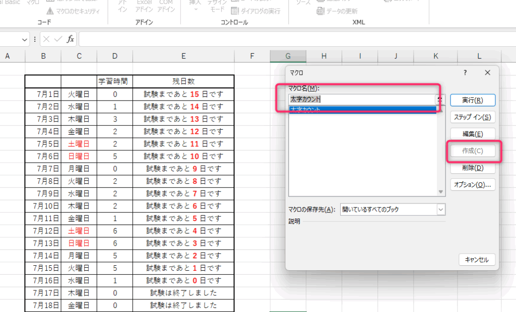 ここに自分でマクロ名を入力します。今回は「太字カウント」と入力しました。