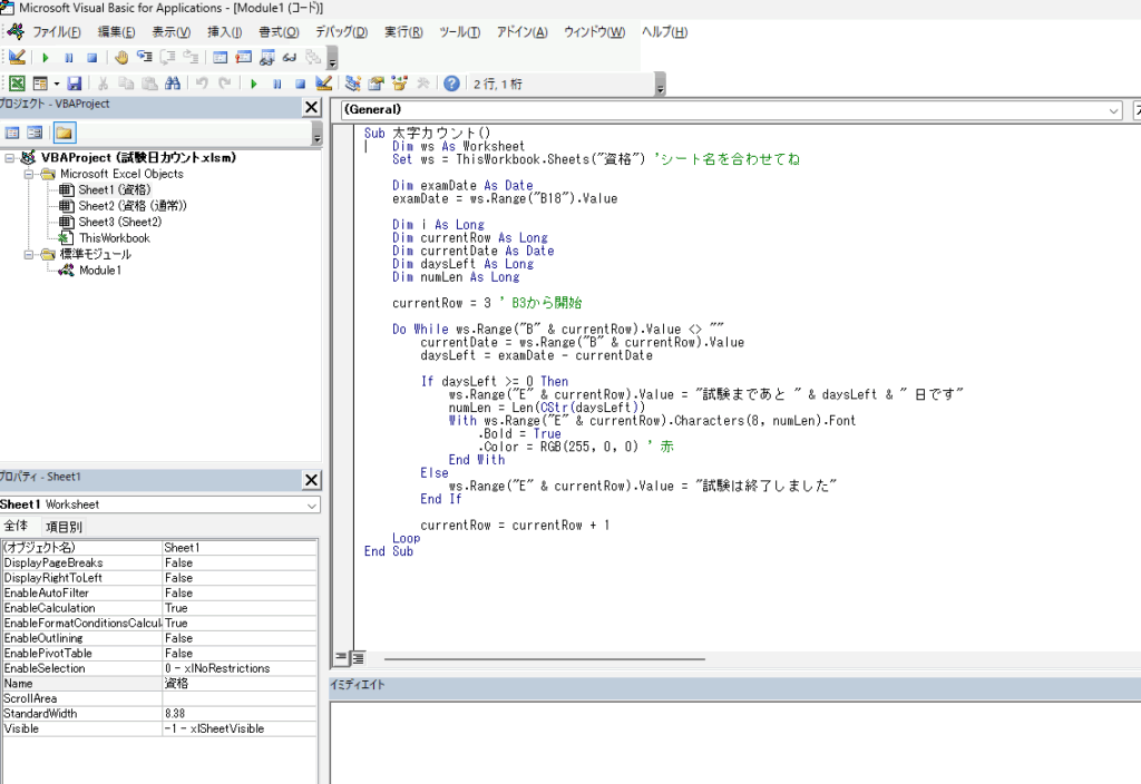 ws.Range("E" & currentRow).Value = "試験まであと " & daysLeft & " 日です"