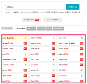 すると、検索結果に取得できるドメイン一覧が表示されます。