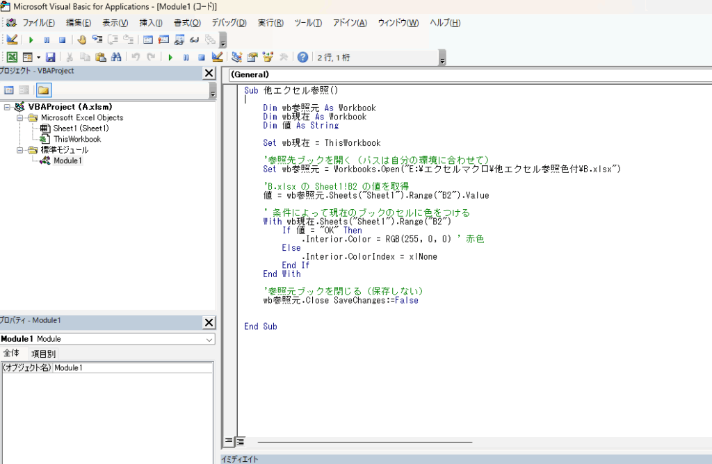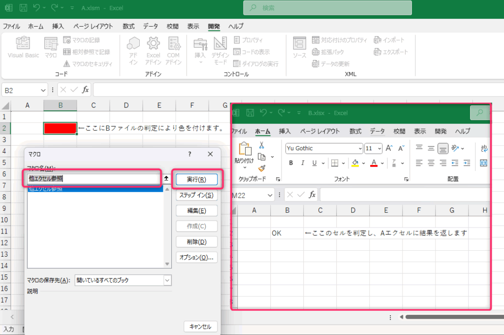 これでAファイルの判定マクロはOKです。これでBファイルのB2に「OK」といれれば Aファイルの「他エクセル参照」マクロを実行した時にAファイルのB2が赤色になります。