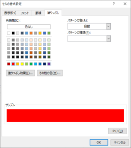 セルの書式設定という窓がでてくるのでで、その中の「塗りつぶしタブ」をクリックしたら任意の色を選択して「OK」をクリック