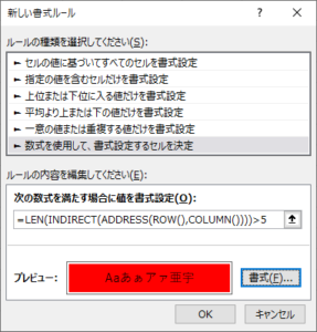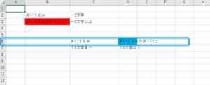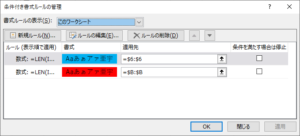 上記の条件書式の結果は5文字以上の文字数入力に対して色で教えてくれるという設定です。