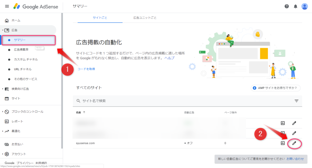 アドセンスの画面を開いたら、左メニューの①「サマリー」をクリックして該当のサイトの②スポイトのマークをクリックします。
