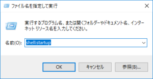 そうすると、ファイル名を指定して実行という窓が開きますので、名前に「shell:startup」と入力してください。